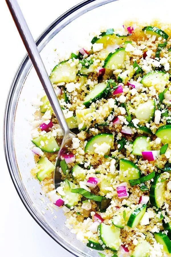 Bring rinsed and drained quinoa to a boil with water and salt. Cover and reduce to a low heat. Cook for 20-25 minutes until water has absorbed. Fluff quinoa with a fork and transfer to bowl. Meanwhile, make lemon vinaigrette by combining lemon juice from 2 lemons, 1 Tbsp. olive oil, and salt to taste. Combine all ingredients and refrigerate salad until chilled. Enjoy!
